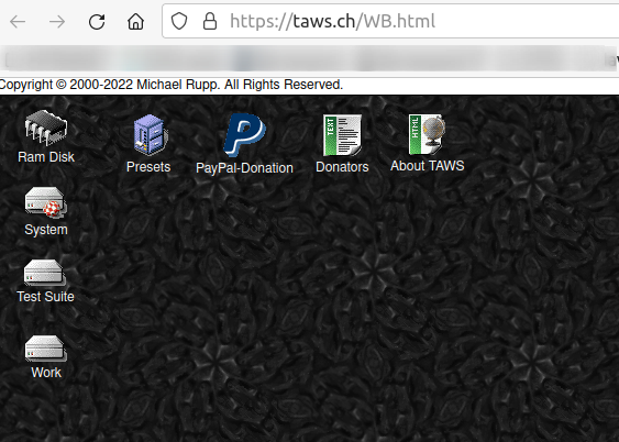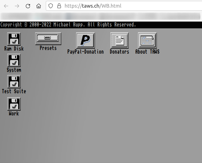 Eigentlich ist der TAWS gar kein Emulator, aber er sieht toll aus. Der TAWS ist eine rein auf JavaScript basierende Simulation der Amiga Workbench. Ziel des Projekts ist das möglichst exakte Aussehen und Gefühl aller Versionen dieses Betriebssystems im Browser nachzubilden, als ob man einen realen Amiga Computer bedient. Spiele kann man natürlich nicht starten.