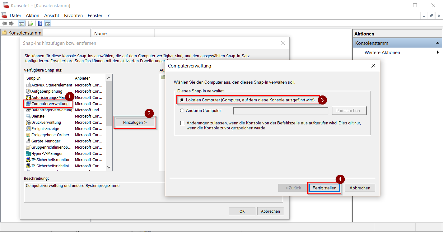 Datei → Snap-In hinzufügen → Computerverwaltung → Hinzufügen → Lokaler Computer