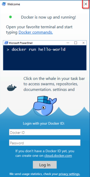 Das Welcome-Fenster von Docker schließen.