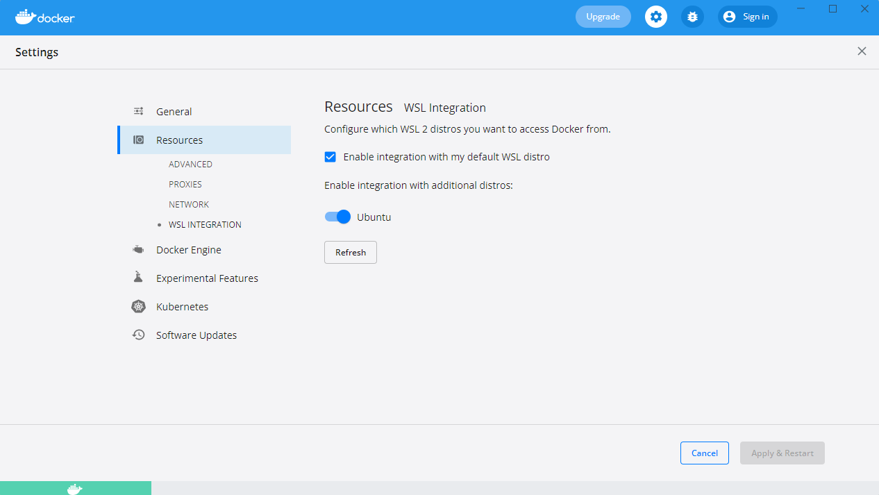 {"registry-mirrors": ["https://docker.foo.network"],"insecure-registries": [],"debug": true,"experimental": false}Danach muss Docker mit Apply neu gestartet werden.3.4. WSL - Integration