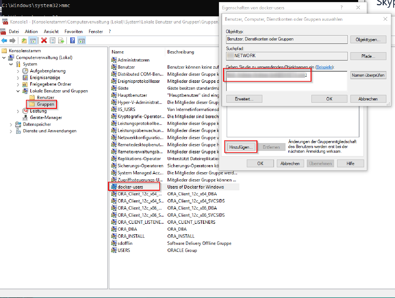 Unter "Lokale Benutzer und Gruppen" → Unterordner Gruppen wählen, Detailansicht zur Rechten füllt sich, ua. mit docker users → Kontextmenü → Eigenschaften → Hinzufügen.